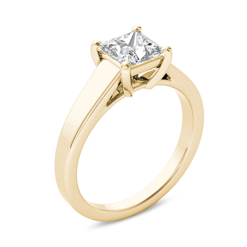 Crafted from glowing 14K yellow gold and featuring one stunning princess cut diamond weighing 1 ct., this solitaire engagement ring is sure to be treasured for eternity Find and design your own 1 carat princess cut diamond ring in 360° HD